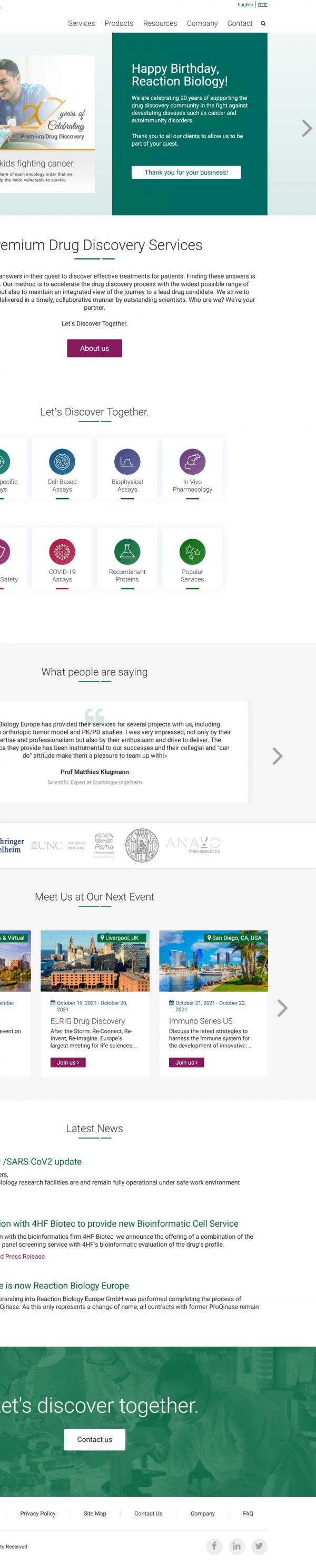 Reaction Biology ist im Bereich Biotech / Krebsforschung tätig. Anforderung war ein Webportal, mit dem Reaction Biology seine komplexen Inhalte für medizinisches Fachpersonal zur Verfügung stellen kann. Entstanden ist dabei ein umfangreiches und hochspezialisiertes Webprojekt, das stetig ausgebaut und erweitert wird.