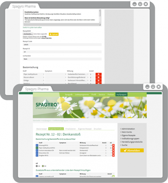 Das Herzstück der Website ist die Rezepturdatenbank zum einfachen Finden von heilpflanzlichen Rezepturen. Registrierte Kunden können dort komfortabel alle Rezepturen für das Spagyro®-System abrufen.