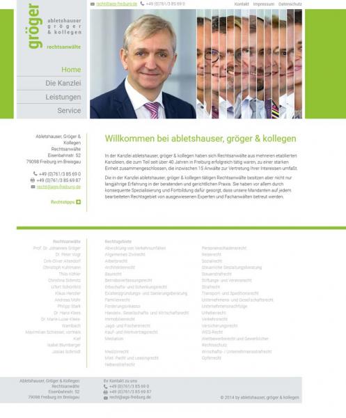 Enstanden ist - in enger Zusammenarbeit mit Abletshauser, Gröger & Kollegen - eine maßgeschneiderte Homepage, die dem User schnell und komfortabel die gewünschte Rechtsleistung vermittelt. Zum Ziel kommt der User wahlweise über die Auswahl der Leistungen aus dem Zivil- und Wirtschaftsrechts oder direkt über die Rechtsanwälte.